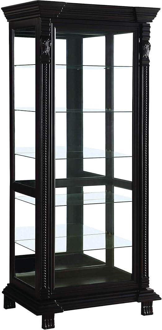 Chrome support beams and all glass sides making viewing from every angle possible. Curio cabinets 950172 63.75 tall curio cabinet with 4 glass shelves glass door and chrome support beams in cappuccino. Coaster company curio cabinet, black and glass. Spacious solid wood curio that's handcrafted in america. Perfect for transitional spaces, its chrome support beams, and cappuccino finish this consumer rating is based on 667 reviews of all coaster products.